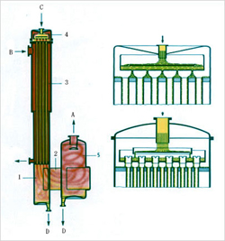 升膜式蒸發(fā)器 升膜式蒸發(fā)器又稱爬升膜蒸發(fā)器,它依據(jù)虹吸泵原理操作,根據(jù)在沸騰過程中產(chǎn)生的蒸汽氣泡的升力,液體和蒸汽并流向上流動(dòng),同時(shí),產(chǎn)生的蒸汽量增加,從而,在管壁上產(chǎn)生流動(dòng)的膜,即液體向上“爬”。并流向上運(yùn)動(dòng)有肋于在液體中產(chǎn)生高度的湍流。 這種蒸發(fā)器的特征是具有長的加熱管(約為5~7M),但加熱室和沸騰室之間的溫度差也必須大,否則,蒸汽流的能量不足于輸送液體和產(chǎn)生爬升的膜。 A:物料進(jìn)口 B:冷凝水出口 C:蒸汽進(jìn)口 D:濃縮液出口 E:二次蒸汽出口 ![]() 降膜式蒸發(fā)器 在降膜蒸發(fā)器中,液體和蒸汽向下并流流動(dòng),需濃縮的液體預(yù)熱至沸騰溫度,均勻的液膜通過蒸發(fā)器頂上的液體分布裝置進(jìn)入加熱管,在沸騰溫度下向下流動(dòng)并部分蒸發(fā),往下運(yùn)動(dòng)引入的重力因并流的蒸汽流不斷加強(qiáng)。 在降膜式蒸發(fā)器中,將液體充分潤濕加熱面對(duì)裝置的無故障操作是極其重要的。如果加熱面沒有充分潤濕,將發(fā)生局部干壁和結(jié)殼,糟糕的情況是加熱管會(huì)被完全堵塞。在臨界情況下,潤濕速率隨蒸發(fā)器效數(shù)的增加或劃分而增加,因此,應(yīng)保持單程操作的優(yōu)點(diǎn)。在這種操作方式下,液體和加熱面的接觸時(shí)間幾乎是恒定的,通常每一程為幾秒種。 除了管材尺寸以外,選擇合適的液體分布裝置對(duì)獲得完全潤濕非常重要,下圖例舉的是兩種液體分布裝置。由于加熱管中液體量低且流速快,產(chǎn)品停留時(shí)間頗為短暫,因此,可以極其溫和地蒸發(fā)熱敏性物料。 ![]() |